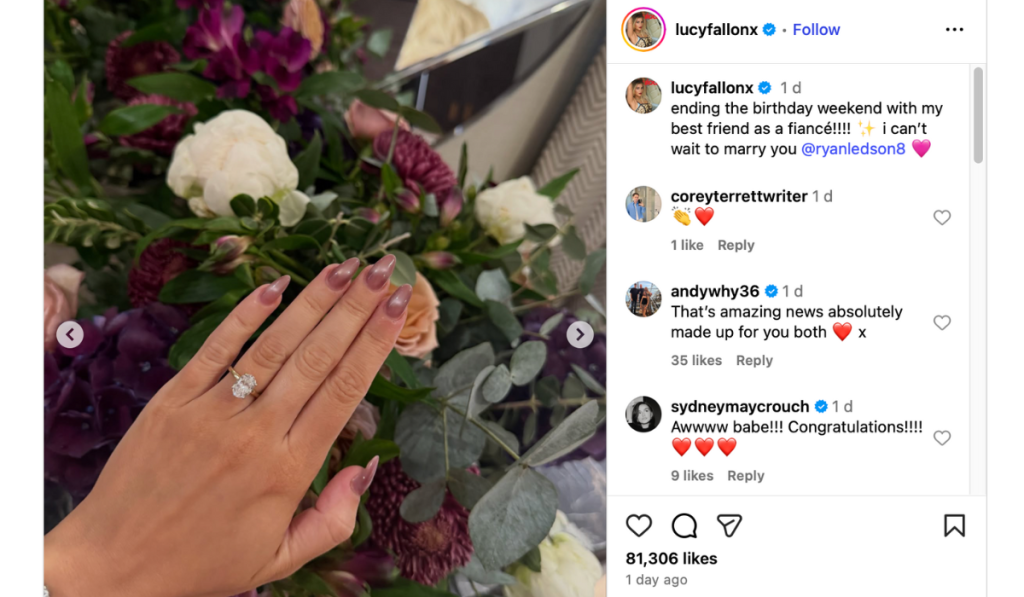 After teasing fans with her birthday posts, Lucy finally shared the big news: Ryan proposed. She posted more photos on Instagram, showing off the ring and the two of them looking absolutely thrilled. In her caption, she said she ended her birthday weekend with her “best friend as a fiancé,” and added that she couldn’t wait to marry him.