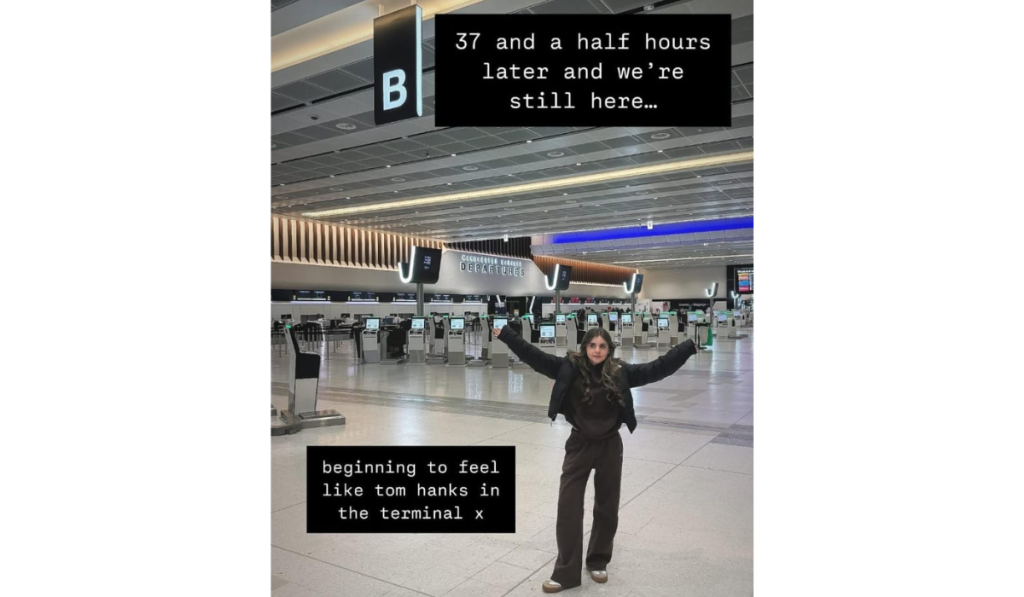 Amid this, Amelia Flanagan shared a picture from inside the airport last night. She took to Instagram and wrote that it had been thirty-seven and a half hours, and they were still there. She added that she has been feeling like Tom Hanks in The Terminal. Today, Amelia shared another picture and said that two days later, she is on the way.
