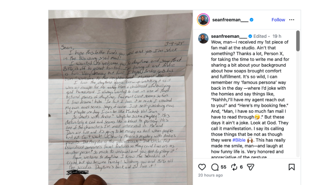 Sean posted a picture of the letter on Instagram and opened up about how it made him feel. The fan who wrote to him also shared a personal story about how soap operas brought comfort and happiness into their life.