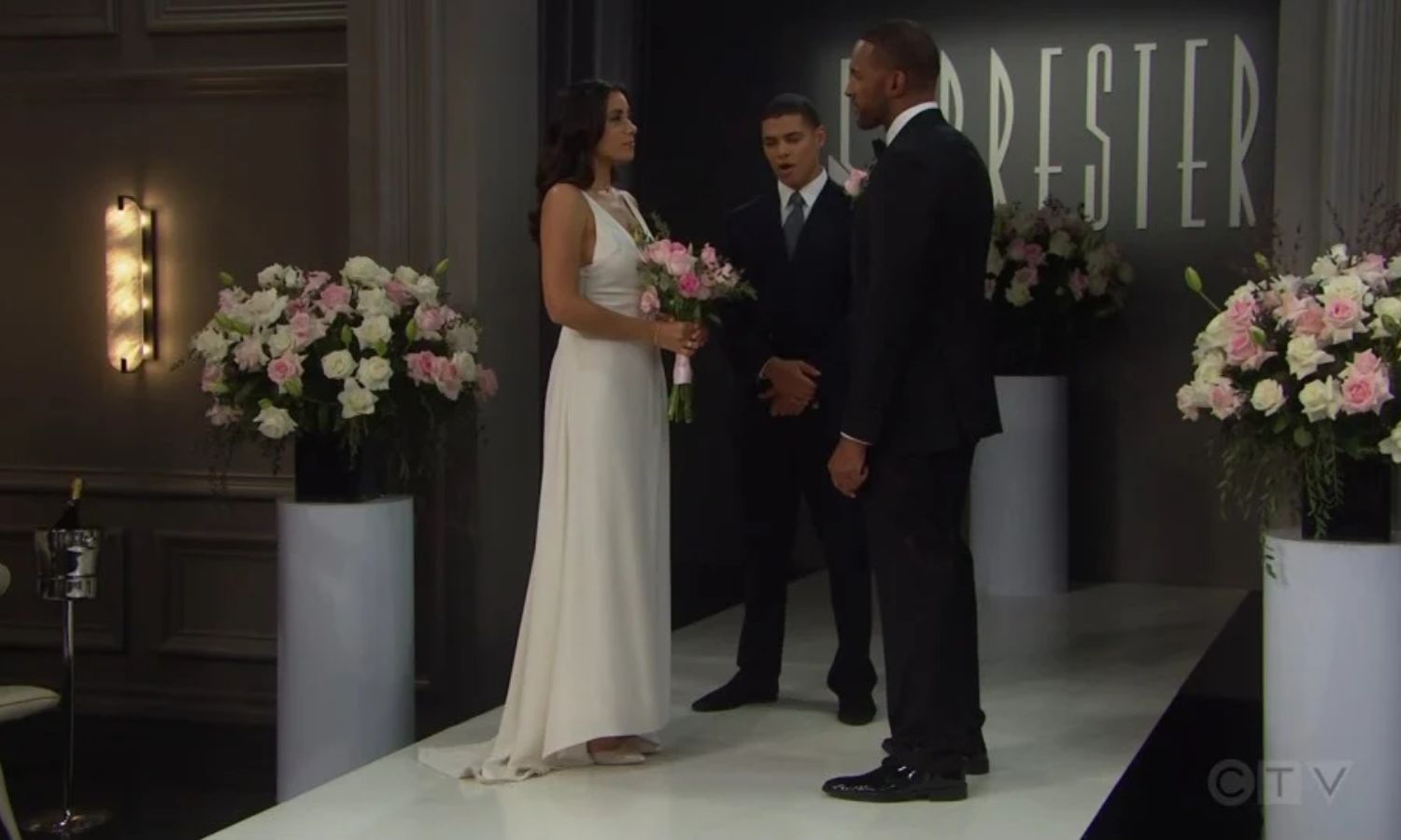 The Forrester showroom held a warm atmosphere as Daphne discovered that Carter had already gathered their closest guests. Steffy, Finn, Ridge, Brooke, Eric, and Donna filled the room with excitement. Each arrival built anticipation as the couple prepared for a ceremony long in the making.